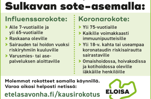 Kausirokotukset, eli influenssa- ja koronarokotukset käynnistyvät Etelä-Savon hyvinvointialueella 13. lokakuuta alkaen. Sulkavan asukkaat voivat nettiajanvarauksen etelasavonha.fi/kausirokotus lisäksi varata kausirokotusajan Sulkavan sote-asemalle puhelinnumerosta 015 5277 165 (arkisin klo 8–15). Kausirokotteiden kohderyhmiin kuuluvat saavat rokotteen maksutta ajanvarauksella
