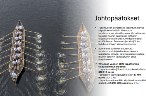 Sulkavan Suursoutujen organisaatio teetti viime kesänä tutkimuksen Sulkavan Suursoutujen talousvaikutuksista Sulkavan kunnalle sekä lähialueille. Jari Kallio Kyselytutkimus tehtiin tapahtumakävijöille Webropol-ohjelmalla sekä paperilomakkeella. Vastauksia kyselyyn saatiin 296 kappaletta. Kyseessä oli Sanna Sillanpään opinnäytetyö ammattikorkeakoulussa. Yleisin ulkopaikkakuntalaisten